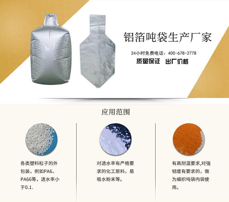 吨袋铝箔袋主要应用于对于内容物有高阻隔要求以及耐高温要求,粒如尼龙粒子(例如PA6、PA66)、填充料、易吸水粉末、化工原料等产品。